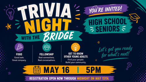 High School Seniors, you’re invited to Trivia Night with The Bridge on May 16! Join us for a fun evening of food, fellowship, and friendly competition as you connect with other young adults and get a taste of what The Bridge is all about. This night is designed just for you—to help you build relationships and feel at home as you step into the next season after graduation. Come hang out, meet new people, and get ready for what’s next!